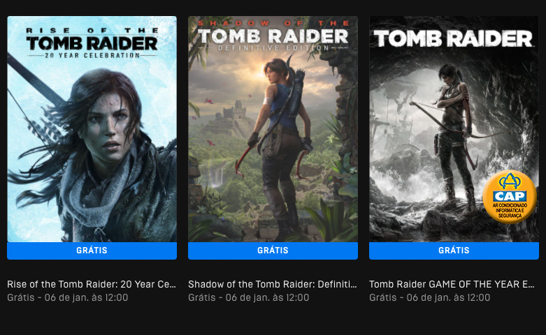 Tomb Raider, Rise of the Tomb Raider e Shadow of the Tomb Raider estão gratuitos para PC.Para resgatar uma cópia de cada, basta acessar as páginas dos títulos (Tomb Raider, Rise e Shadow) e clicar em “Obter”. Após finalizar o pedido, cada jogo será adicionado automaticamente à sua biblioteca.